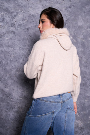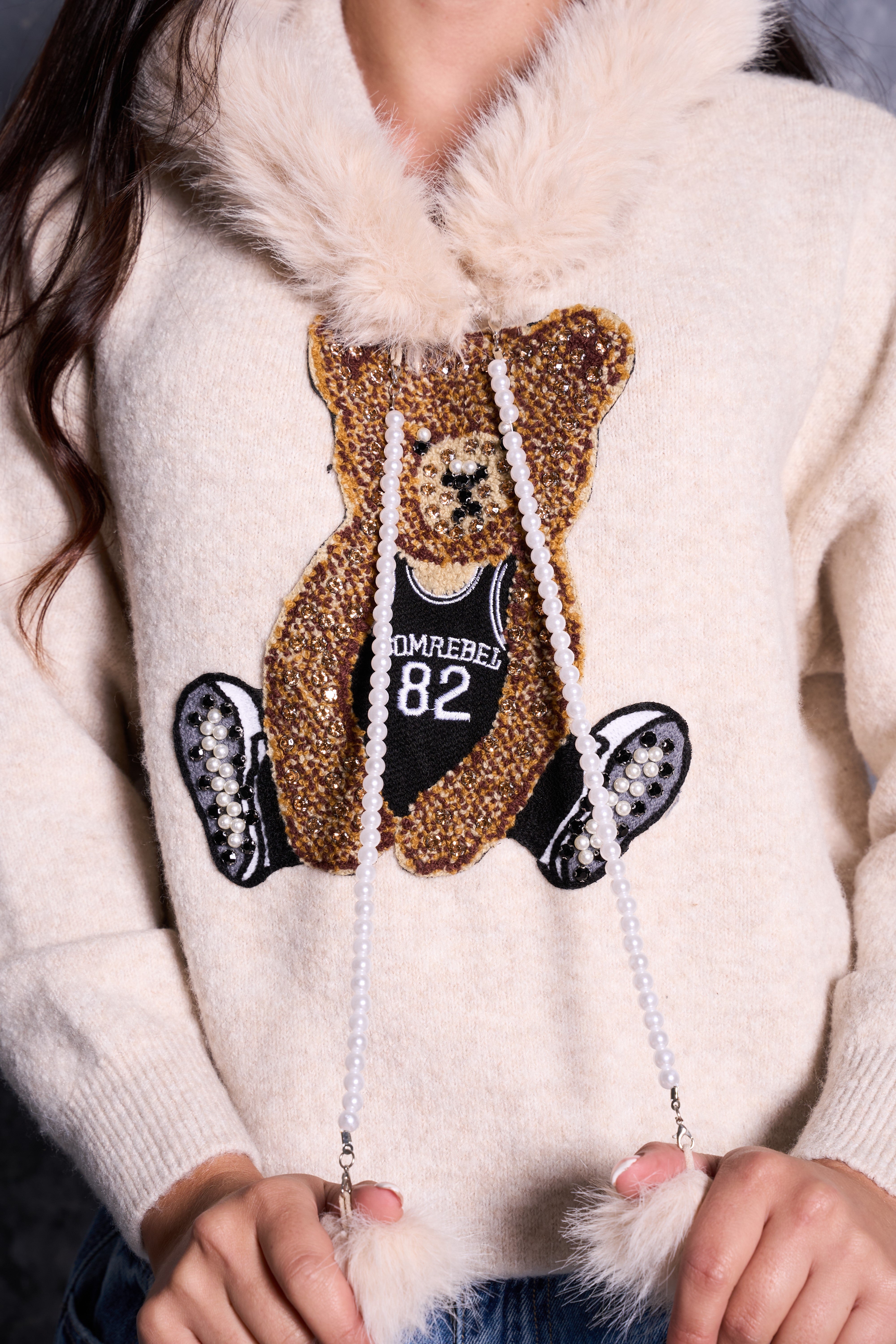 Buso con aplique de oso en pedrería y perlas, cordones de capucha en perlas. Capucha con borde de pelo sintético.