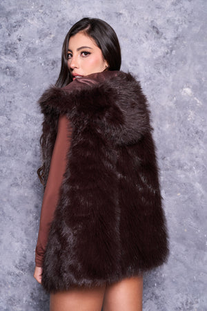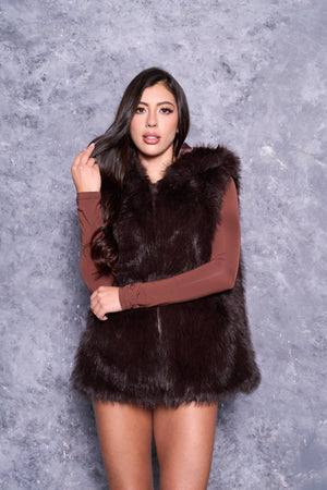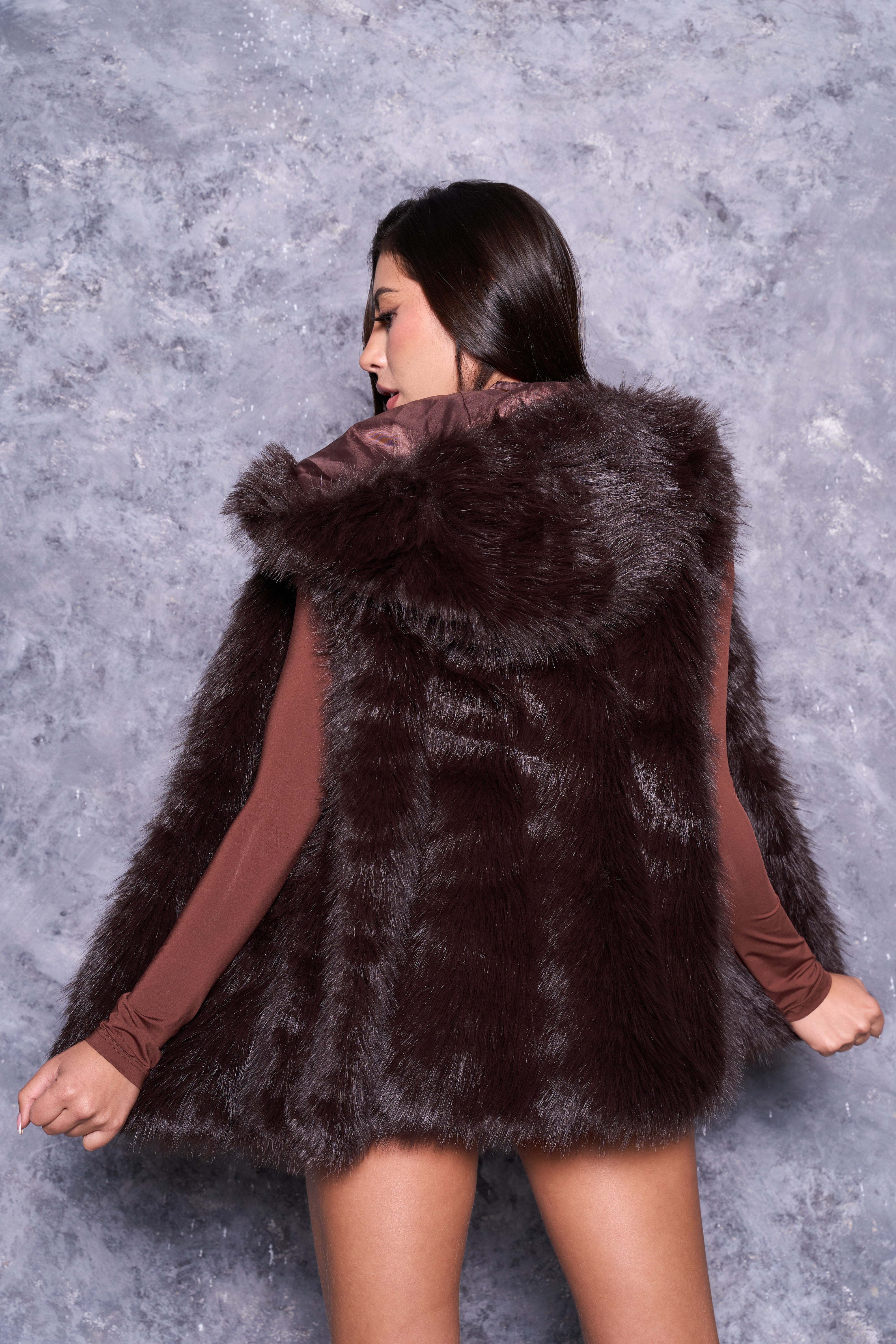 Chaleco con capucha cubierto de pelo sintético, apertura con cierre.