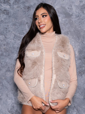 Chaleco sin mangas de acabado premium, elaborado en textura suave tipo piel con delicados detalles de perlas que realzan su sofisticación. Diseño refinado con bolsillos frontales y silueta impecable, ideal para elevar cualquier look con un aire de lujo y distinción. Una pieza statement atemporal y elegante.