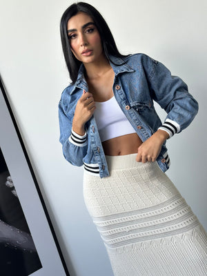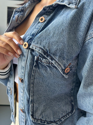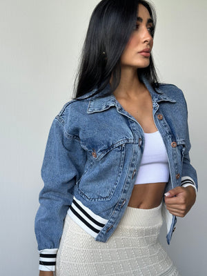 CHAQUETA AMERICANA ELABORADA EN DENIM, ES CORTA CON DETALLE EN MANGAS Y EN SU PARTE INFERIOR