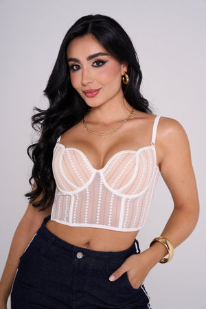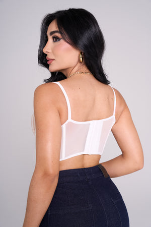 Corsé en Malla Bordada, diseñado para realzar la silueta con delicadeza y sofisticación. Su malla semitransparente con detalles bordados aporta un toque romántico y moderno, ideal para looks especiales o combinaciones fashion con carácter y estilo.