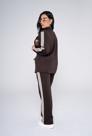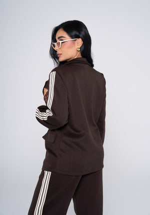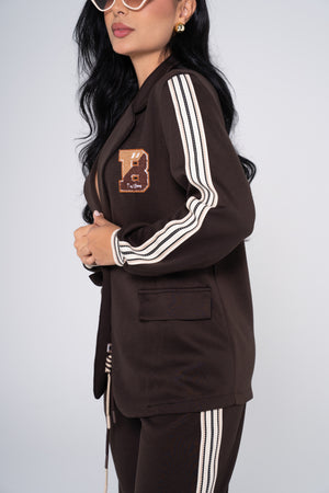 Set Blazer Pantalón VK, una fusión perfecta entre elegancia y tendencia deportiva. El blazer de corte moderno con detalles en contraste aporta carácter y estilo, mientras que el pantalón de silueta cómoda y líneas laterales completa un look versátil, ideal para outfits casual chic con personalidad.